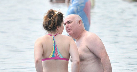 Galerinin tamamı için tıklayınızUsta oyuncu, eşini öpmeye doyamadı. Etraftaki gözlere aldırış etmeden birbirlerini öpücük yağmuruna tutan ikili, kahkalarla denizden çıktı.