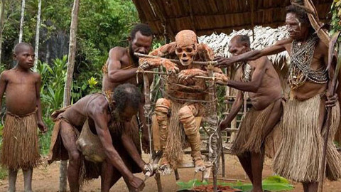 Papua Yeni Gine'de korkunç bir gelenek görenleri dehşete düşürüyor. Ülkenin Morobe bölgesinde dağ köylerinde hala devam eden gelenek hükümet tarafından yasaklandı. Ancak köylerde hala uygulanmaya devam ediyor. Köylüler ölen yakınlarının cesetlerini gömmek yerine köyün dağlık bölgelerinde bambu kafeslerin içinde saklamaya devam ediyorlar. Ölü erkek, kadın ve çocuklar etkin bir şekilde, tütsülenmiş ringa balığı pişirme tekniğiyle aynı işleme tabi tutuluyor. İlk olarak deneyimli mumyalayıcılar kadavraların ayak, diz ve dirseklerinde vücuttaki yağın akması için kesikler açıyor ve bamboo direklerini bağırsaklarına sokarak kalan damlaları topluyor. Bu yağ, cesedin yaşayan yakınlarının ciltlerine ve saçlarına sürülüyor böylece ölünün gücünün yaşayana geçeceğine inanılıyor. Geri kalanı da aynı sebeple yemek yağı olarak kullanılıyor. Sonrasında cesedin içine hava girip çürütmemesi için göz, ağız ve anüs kısımları dikilerek kapatılıyor. Ayak tabanları, avuç içleri ve dil kesiliyor ve yaşayan eşine takdim ediliyor. Vücudun kalanı ise ateş çukurunun üzerinde tütsülenerek kurutuluyor ve leşçil hayvanları uzak tutması için balçık ve toprak boyasıyla kaplanıyor. Morobe dağlıklarındaki falezler, bazıları 200 yıl ya da öncesinden kalma bu cesetlerle dolu. Bazıları özel kutlamalarda indirilip kutlama sonrası yeniden geri götürülüyor. İşte o görüntüler...