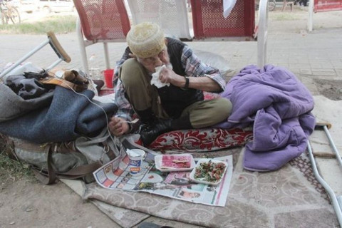 Galerinin tamamı için tıklayınızİki elinin parmakları olmayan ve yürüme zorluğu çekip koltuk değnekleriyle ayakta durabilen yaşlı adam, havaların soğumaya başlamasına rağmen parkta kalmaya devam ediyordu.