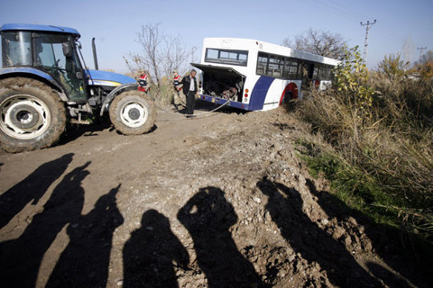 Galerinin tamamı için tıklayınızNATO çalışanları Hasırcılar köyü yakınlarında meydana gelen bu olay nedeniyle mecburen araçtan indiler. Heyet, inceleme yapılacak yaklaşık 500 metre ilerideki atış sahasının yanındaki boş araziye yürüyerek geçti. Çamura saplanan araç, köylülerin traktörleriyle saplandığı yerden çıkarıldı.