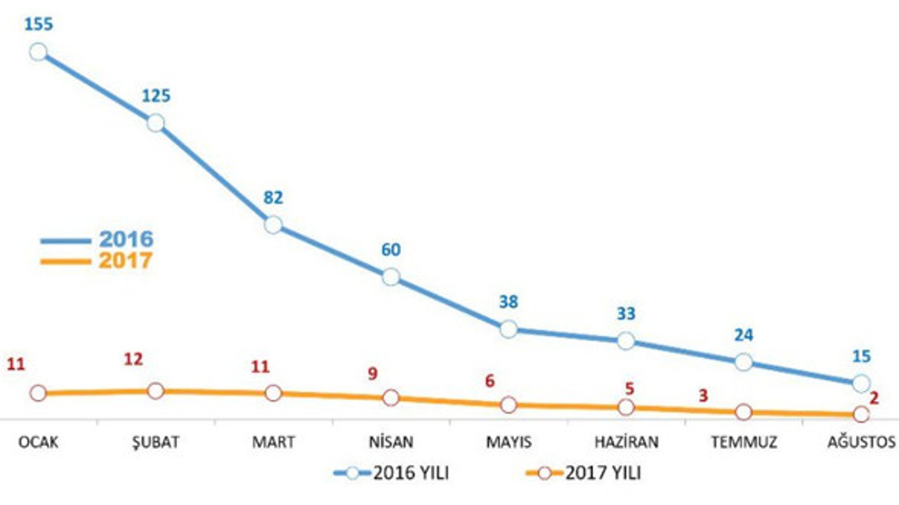 İçişleri Bakanlığı, terör örgütü PKK'ya katılımlarla ilgili hazırlanan grafikleri yayınladı. Bakanlığı Twitter hesabından yayınlanan grafiklerde, örgüte katılımlarda yüzde 89 oranında keskin bir düşüşün meydana geldiği ortaya kondu. Teslim olan teröristlerle ilgili hazırlanan grafikte ise yükselmenin olduğu izlendi. Yayınlanan grafikte, her geçen gün daha fazla teröristin pişman olarak güvenlik güçlerine teslim olduğu belli oluyor.