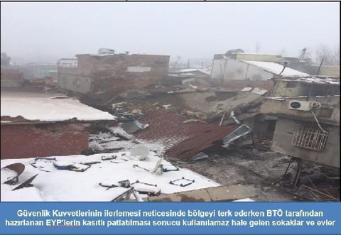 DİYARBAKIR Sur'da güvenlik güçlerinin ilerlemesi neticesinde PKK'lılar bölgeyi terk ederken önceden hazırladıkları El Yapımı Patlayıcı'ları (EYP)'lerin kasıtlı patlatmaları sonucu birçok sokak ve ev kullanılamaz hale geldi. Güvenlik güçlerinin Diyarbakır Sur'da sürdürdüğü operasyonlarda 5 Ocak 2015 tarihi itibariyle 62 PKK'lı etkisiz hale getirildi. Güvenlik güçlerinin bölgede ilerlemesi neticesinde PKK'lılar bölgeyi terk ederken önceden hazırladıkları El Yapımı Patlayıcı'ları (EYP)'lerin kasıtlı patlatmaları sonucu birçok sokak ve ev kullanılamaz hale geldi. PKK'lılar önceden bölgede mevzi olarak kullandıkları birçok evi de ateşe verdi. Yapılan operasyonlarda PKK'lıların birçok evde tüp kullanarak tuzak hazırladıkları tespit edildi. PKK'lıların Sur'da bulanan Süleyman Nazif İlköğretim Okulu'nu ateşe verdiği bildirildi.