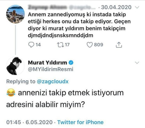 Galerinin tamamı için tıklayınızSosyal medya kullanıcısı genç kadın, “Annem zannediyormuş ki Instagram'da takip ettiği herkes onu da takip ediyor. Diyor ki; Murat Yıldırım benim takipçim" şeklinde tweet attı. Yıldırım, bu paylaşım üzerine, "Annenizi takip etmek istiyorum, adresini alabilir miyim?” diyerek hayranını takibe alarak yaptığı jest takdir topladı.