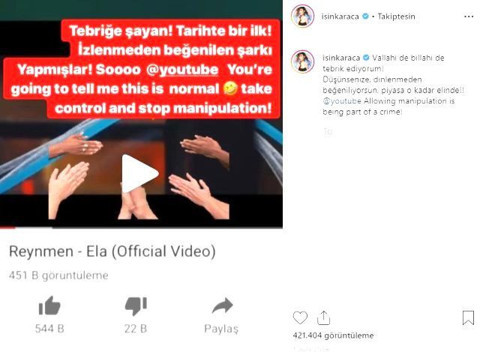2019'da klibi Ela ile kısa sürede 33 milyon dinlenerek Türkiye'nin gündemine oturan Reynmen, tıklanma oranlarına inanmayan Işın Karaca'ya isim vermeden gönderme yapmıştı. Reynmen, 'Şarkıların baya milyon izlendi ve ünlülerin iyi ve kötü tepkilerine ne demek istiyorsun?' sorusuna "Hepsine çok teşekkür ederim.Yorumları benim için çok değerli iyi veya kötü.Ama bazı or..." diyerek sözünü yarıda kesmiş ve şöyle devam etmişti: