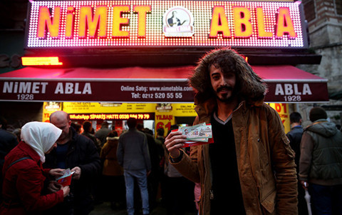 İstanbul'da, Milli Piyango'nun yılbaşı özel çekiliş biletlerinin satışı sürüyor. Vatandaşlar 61 milyon liralık büyük ikramiye için hafta sonu Eminönü'ndeki Nimet Abla gişesi önünde uzun kuyruklar oluşturdu. Biletlerini alan kimi vatandaşlar, gişe önünden sevinçle ayrıldı. Milli Piyango’nun yılbaşı için belirlediği büyük ikramiye olan 61 milyon lirayı kazanmak isteyen yüzlerce kişi, Eminönü’ndeki Nimet Abla gişelerine akın etti. Yağmura rağmen gişelerin önünde uzun kuyruk oluşturanlar saatlerce bekledi. Yılbaşı bileti almak için şehir dışından bile geldiğini söyleyenler vardı. Eminönü’ndeki uzun kuyrukta beklemek istemeyenler de çevredeki seyyar satıcılardan yılbaşı bileti aldı. Eminönü'nde Milli Piyango bileti satın almak için Bahçekapı'daki Nimet Abla gişesine akın eden binlerce vatandaş, uzun kuyruklar oluşturdu. Bu yıl Milli Piyango İdaresi tarafından belirlenen 61 milyon liralık büyük ikramiyeye ilgi de büyük oldu. Eminönü'nde Milli Piyango bileti satın almak için Bahçekapı'daki Nimet Abla gişesine akın eden binlerce vatandaş, uzun kuyruklar oluşturdu. Bu yıl Milli Piyango İdaresi tarafından belirlenen 61 milyon liralık büyük ikramiyeye ilgi de büyük oldu.