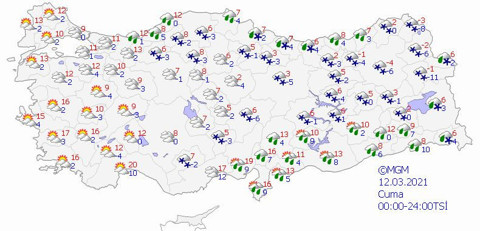 Galerinin tamamı için tıklayınız12 Mart cuma günü kar yağışı beklenen iller