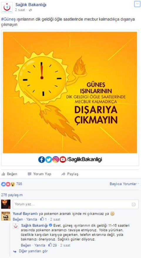 Galerinin tamamı için tıklayınızSağlık Bakanlığı'nın resmi Facebook hesabından gün içerisinde, "Güneş ışınlarının dik geldiği öğle saatlerinde mecbur kalmadıkça dışarıya çıkmayın" başlığı ile bilgilendirme paylaşımı yapıldı. Bir vatandaş ise bu paylaşıma "Ya Pokemon aramak içinde mi çıkamıcaz ya" şeklinde yorum yazdı.