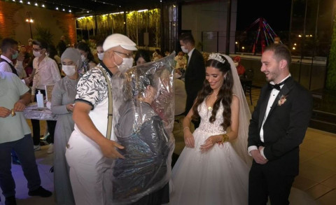 Samsun'da düğünde görülmemiş önlem: Kafasına poşet geçirip gelin ve damada sarıldı