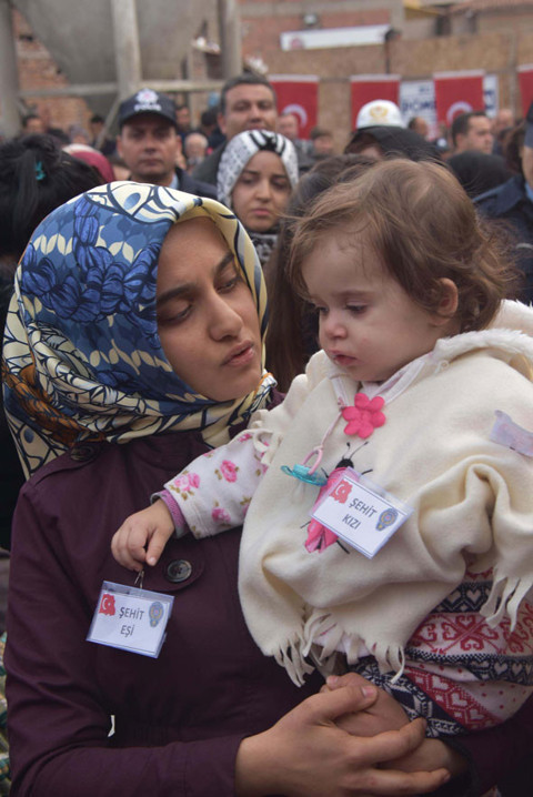 Galerinin tamamı için tıklayınız"BABANIN DÜĞÜNÜNE GELDİK" Şehit polis memurunun eşi Yeşim Taşdemir, cenaze töreni boyunca büyük metanet gösterdi. Taşdemir, çevresindekilere de sık sık, "Dik durun, anneanne, ezanı susturmadı bayrağı indirmedi. Başınız dik olsun. Ağlamayın, düşmanları sevindirmeyin" dedi. Kucağına aldığı 1 yaşındaki kızı Esma'yı da seven ve ona su içiren Yeşim Taşdemir, "Babanın düğününe geldik" dedi. Anne Saliha Üray da cenaze töreni boyunca oğlunun gömleğine sarıldı.