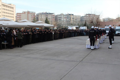 Galerinin tamamı için tıklayınızEmniyet Müdürlüğünde düzenlenen törende, şehit polis memurları Ocak, Sevim, Özcan ve Ava'nın meslektaşlarının omuzlarında taşınan Türk bayrağına sarılı naaşları katafalka konuldu, öz geçmişleri okundu, dua edildi.