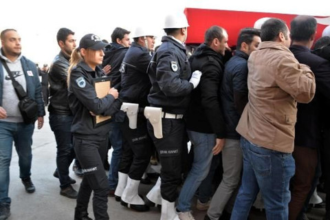 Galerinin tamamı için tıklayınızSur İlçesi'nden çıkarılan hafriyatın döküldüğü alanda güvenlik önlemi alan polislere yönelik düzenlenen ve 4 polisin şehit olduğu bombalı terör saldırısında ağır yaralanan ve tedavi gördüğü hastanede dün şehit olan polis memuru Faruk Demir için uğurlama töreni düzenlendi.