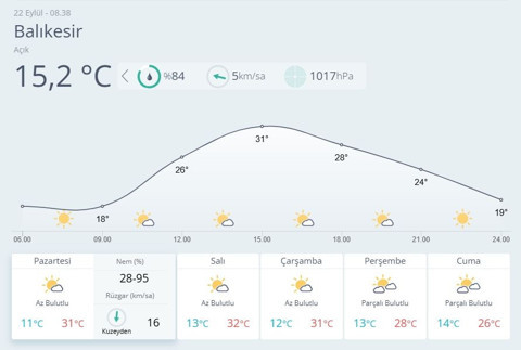 Meteoroloji'den alınan bilgiye göre bugün yurt genelinde açık ve az bulutlu bir hava bekleniyor. Karadeniz'in iç kesimlerinden sıcaklık, 3 ilâ 5 derece yükseliyor. Marmara, Kuzey Ege ve Doğu Anadolu'da kuvvetli rüzgar var. İşte illerimizde hava durumu ve sıcaklıklar...Meteoroloji'den alınan bilgiye göre bugün yurt genelinde açık ve az bulutlu bir hava bekleniyor. Karadeniz'in iç kesimlerinden sıcaklık, 3 ilâ 5 derece yükseliyor. Marmara, Kuzey Ege ve Doğu Anadolu'da kuvvetli rüzgar var. İşte illerimizde hava durumu ve sıcaklıklar... Meteoroloji Genel Müdürlüğü tarafından yapılan tahminlere göre ülkemizin kuzey ve doğu kesimlerinin parçalı, yer yer çok bulutlu, diğer yerlerin az bulutlu ve açık geçeceği tahmin ediliyor.KARADENİZ'DE SICAKLIK ARTIYOR Hava sıcaklığının, Karadeniz'in iç kesimlerinde 3 ila 5 derece artacağı, diğer yerlerde önemli bir değişiklik beklenmiyor. 3 BÖLGEDE KUVVETLİ RÜZGAR Rüzgarın genellikle kuzeyli yönlerden hafif, ara sıra orta kuvvette, Marmara, Kuzey Ege, Doğu Anadolu'nun güneybatısında kuvvetli (40-60 km/saat) esmesi bekleniyor.