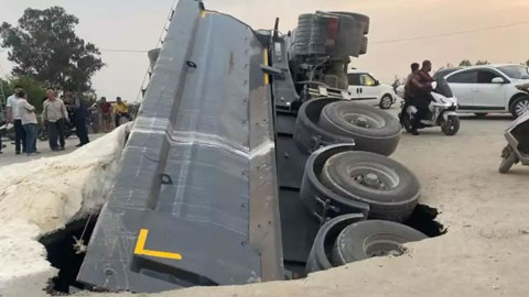 Sürücüsü öğrenilemeyen 01 AIL 179 plakalı kum yüklü tır, yolda oluşan çukura düştü.