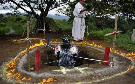 Galerinin tamamı için tıklayınızİçine şeytan kaçtığını düşündükleri kişileri, yerde çiçeklerle oluşturulan dairenin ortasına çizilen üçgene yatıran Cifuentes, vücutları ve yüzlerini toprağa buladığı, gözlerini bağladığı "hastalarını" dualarla tedavi ettiğini iddia ediyor.