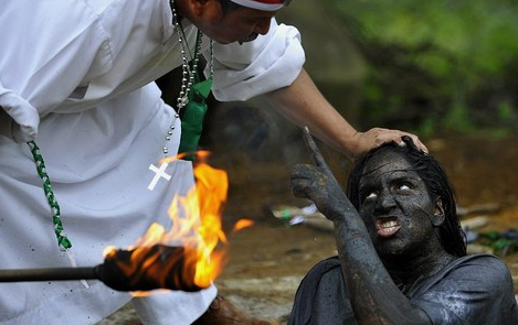 Boyunlarına haç bağlanan kişiler, ayin sırasında çığlıklar atıyor, ağlıyor. Cifuentes, ayin sırasında kötü ruhları kovduğuna inanılan yumurta ve limon da kullanıyor.