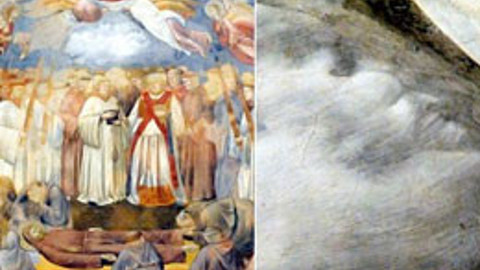 Freskodaki bulut kümelerinin arasına gizlenmiş olan çengel burunlu şeytan profili, yerden bakıldığı zaman çok zor seçilebiliyor. Assisi'li Aziz Francesco'nun ölümünü konu alan fresko, 13'üncü yüzyıldan kalma.