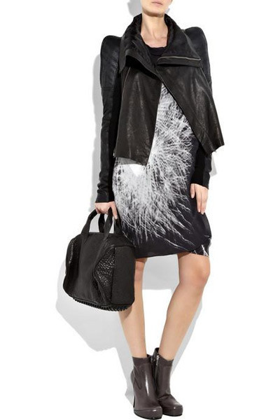 bir kumaşın üzerine eklenmiş deri şeritler. Üçgen bir siluet;