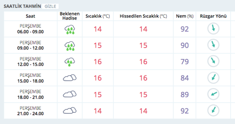 İSTANBUL'da hava sıcaklığı 8 derece birden düşerken AKOM'dan kuvvetli yağış alarmı verildi. İDO boğazdaki bir çok seferi iptal etti. Meteoroloji ise son hava durumu raporunu yayınladı ve İstanbul ile birlikte Sakarya, Yalova , Düzce ve Kocaeli illerinde de alarm verdi. Bu illerde sabah saatlerinde başlayan kuvvetli yağışlar çok kuvvetli olarak gece saatlerine kadar devam edecek. Meteoroloji Tekirdağ çevreleri ile Kırklareli’nin kıyı kesimlerinin sağanak yağışlı geçeceğini bildirdi. Bursa, Balıkesir, Zonguldak başta olmak üzere Karadeniz'in tamamında da yağış görülecek. İşte yağmur alarmı verilen illerin saatlik hava durumu tahmini; İSTANBUL hava durumu : Meteoroloji ile birlikte AKOM'da İstanbul için kuvvetli yağış uyarısı verdi. Boğazda seferler aksıyor. İDO bazı seferleri iptal etti. Yağmur öğlen saatlerine kadar gökgürültülü ve sağanak şeklinde görülecek. Gece saatlerine kadar da sağanak yağış hız kesmeden devam edecek. Hava sıcaklığı İstanbul'da 6 ile 8 derece arasında düştü. Yarın İstanbul parçalı bulutlu bir gün geçirecek ancak Cumartesi günü yine yağmurlu bir hava hüküm sürecek. Kocaeli meteoroloji saatlik hava durumu tahmini Sakarya meteoroloji saatlik hava durumu tahmini Düzce meteoroloji saatlik hava durumu tahmini Yalova meteoroloji saatlik hava durumu tahmini Bursa meteoroloji saatlik hava durumu tahmini Rize meteoroloji saatlik hava durumu tahmini Samsun meteoroloji saatlik hava durumu tahmini Zonguldak meteoroloji saatlik hava durumu tahmini