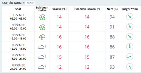 İSTANBUL'da hava sıcaklığı 8 derece birden düşerken AKOM'dan kuvvetli yağış alarmı verildi. İDO boğazdaki bir çok seferi iptal etti. Meteoroloji ise son hava durumu raporunu yayınladı ve İstanbul ile birlikte Sakarya, Yalova , Düzce ve Kocaeli illerinde de alarm verdi. Bu illerde sabah saatlerinde başlayan kuvvetli yağışlar çok kuvvetli olarak gece saatlerine kadar devam edecek. Meteoroloji Tekirdağ çevreleri ile Kırklareli’nin kıyı kesimlerinin sağanak yağışlı geçeceğini bildirdi. Bursa, Balıkesir, Zonguldak başta olmak üzere Karadeniz'in tamamında da yağış görülecek. İşte yağmur alarmı verilen illerin saatlik hava durumu tahmini; İSTANBUL hava durumu : Meteoroloji ile birlikte AKOM'da İstanbul için kuvvetli yağış uyarısı verdi. Boğazda seferler aksıyor. İDO bazı seferleri iptal etti. Yağmur öğlen saatlerine kadar gökgürültülü ve sağanak şeklinde görülecek. Gece saatlerine kadar da sağanak yağış hız kesmeden devam edecek. Hava sıcaklığı İstanbul'da 6 ile 8 derece arasında düştü. Yarın İstanbul parçalı bulutlu bir gün geçirecek ancak Cumartesi günü yine yağmurlu bir hava hüküm sürecek. Kocaeli meteoroloji saatlik hava durumu tahmini Sakarya meteoroloji saatlik hava durumu tahmini Düzce meteoroloji saatlik hava durumu tahmini Yalova meteoroloji saatlik hava durumu tahmini Bursa meteoroloji saatlik hava durumu tahmini Rize meteoroloji saatlik hava durumu tahmini Samsun meteoroloji saatlik hava durumu tahmini Zonguldak meteoroloji saatlik hava durumu tahmini