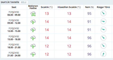 İSTANBUL'da hava sıcaklığı 8 derece birden düşerken AKOM'dan kuvvetli yağış alarmı verildi. İDO boğazdaki bir çok seferi iptal etti. Meteoroloji ise son hava durumu raporunu yayınladı ve İstanbul ile birlikte Sakarya, Yalova , Düzce ve Kocaeli illerinde de alarm verdi. Bu illerde sabah saatlerinde başlayan kuvvetli yağışlar çok kuvvetli olarak gece saatlerine kadar devam edecek. Meteoroloji Tekirdağ çevreleri ile Kırklareli’nin kıyı kesimlerinin sağanak yağışlı geçeceğini bildirdi. Bursa, Balıkesir, Zonguldak başta olmak üzere Karadeniz'in tamamında da yağış görülecek. İşte yağmur alarmı verilen illerin saatlik hava durumu tahmini; İSTANBUL hava durumu : Meteoroloji ile birlikte AKOM'da İstanbul için kuvvetli yağış uyarısı verdi. Boğazda seferler aksıyor. İDO bazı seferleri iptal etti. Yağmur öğlen saatlerine kadar gökgürültülü ve sağanak şeklinde görülecek. Gece saatlerine kadar da sağanak yağış hız kesmeden devam edecek. Hava sıcaklığı İstanbul'da 6 ile 8 derece arasında düştü. Yarın İstanbul parçalı bulutlu bir gün geçirecek ancak Cumartesi günü yine yağmurlu bir hava hüküm sürecek. Kocaeli meteoroloji saatlik hava durumu tahmini Sakarya meteoroloji saatlik hava durumu tahmini Düzce meteoroloji saatlik hava durumu tahmini Yalova meteoroloji saatlik hava durumu tahmini Bursa meteoroloji saatlik hava durumu tahmini Rize meteoroloji saatlik hava durumu tahmini Samsun meteoroloji saatlik hava durumu tahmini Zonguldak meteoroloji saatlik hava durumu tahmini