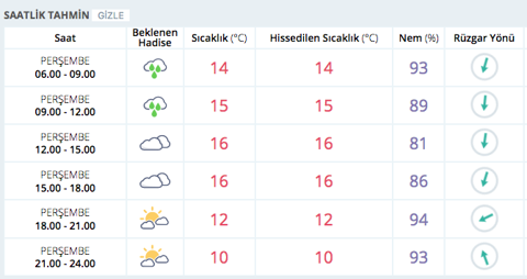 İSTANBUL'da hava sıcaklığı 8 derece birden düşerken AKOM'dan kuvvetli yağış alarmı verildi. İDO boğazdaki bir çok seferi iptal etti. Meteoroloji ise son hava durumu raporunu yayınladı ve İstanbul ile birlikte Sakarya, Yalova , Düzce ve Kocaeli illerinde de alarm verdi. Bu illerde sabah saatlerinde başlayan kuvvetli yağışlar çok kuvvetli olarak gece saatlerine kadar devam edecek. Meteoroloji Tekirdağ çevreleri ile Kırklareli’nin kıyı kesimlerinin sağanak yağışlı geçeceğini bildirdi. Bursa, Balıkesir, Zonguldak başta olmak üzere Karadeniz'in tamamında da yağış görülecek. İşte yağmur alarmı verilen illerin saatlik hava durumu tahmini; İSTANBUL hava durumu : Meteoroloji ile birlikte AKOM'da İstanbul için kuvvetli yağış uyarısı verdi. Boğazda seferler aksıyor. İDO bazı seferleri iptal etti. Yağmur öğlen saatlerine kadar gökgürültülü ve sağanak şeklinde görülecek. Gece saatlerine kadar da sağanak yağış hız kesmeden devam edecek. Hava sıcaklığı İstanbul'da 6 ile 8 derece arasında düştü. Yarın İstanbul parçalı bulutlu bir gün geçirecek ancak Cumartesi günü yine yağmurlu bir hava hüküm sürecek. Kocaeli meteoroloji saatlik hava durumu tahmini Sakarya meteoroloji saatlik hava durumu tahmini Düzce meteoroloji saatlik hava durumu tahmini Yalova meteoroloji saatlik hava durumu tahmini Bursa meteoroloji saatlik hava durumu tahmini Rize meteoroloji saatlik hava durumu tahmini Samsun meteoroloji saatlik hava durumu tahmini Zonguldak meteoroloji saatlik hava durumu tahmini