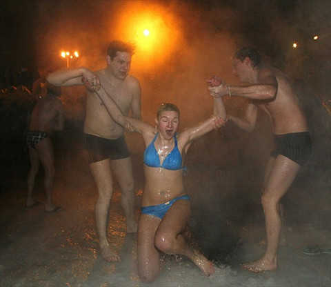 Galerinin tamamı için tıklayınızRusya genelinde - 30 dereceye inen soğuk hava ve kar yağışına aldırmayan Ruslar 'yeniden doğuş' inanışıyla buzlu suya giriyor. Hz. İsa'nın vaftiz edildiği gün olan Epifani'yi kutlayan Ortodokslar inançları gereği buzlu suya giriyor. Bu görüntüler kış günlerini yaşadığımız şu günlerde bizim bile içimizi üşütüyor. Ama bu ritüel küçük yaşlardan itibaren buzlu suya girmeye alışan Ortodoks inancına mensup Ruslar için vücutlarının direnç kaynağı.