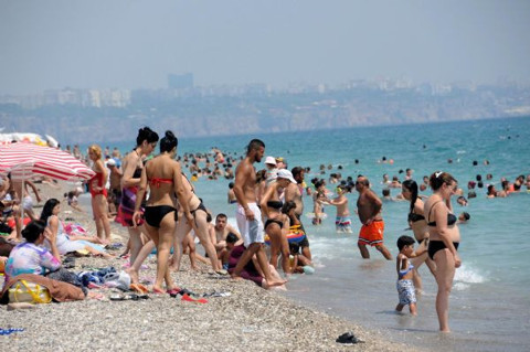 Antalya'da sıcak ve nemli havadan bunalanlar, dünyaca ünlü Konyaaltı Sahili'ne akın etti.