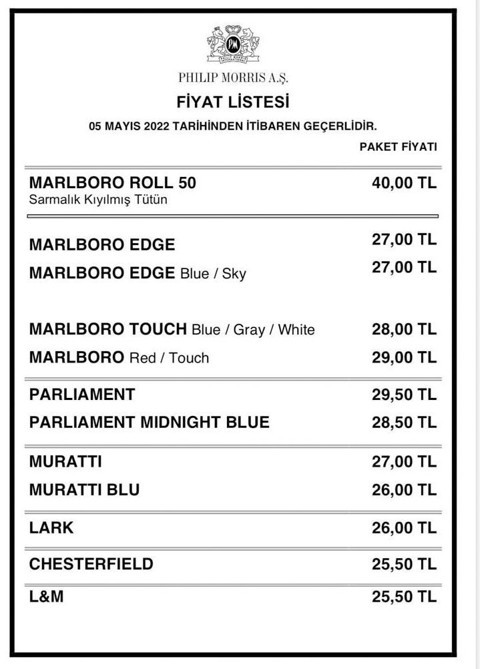 Türkiye Tekel Bayiler Platformu Başkanı Özgür Aybaş, sosyal medya üzerinden yaptığı paylaşımda TT grubu sigara markalarına 2 liralık zam geldiğini duyurdu, güncel sigara fiyatlarının listesini paylaştı. Listeye göre TT grubunda en ucuz sigara 20 lira, en pahalı sigara ise 27 lira oldu. Camel, Winston, Samsun, Tekel 2000 sigaraları ile biralara da zam yapıldı. Bugün itibari ile Efes ithal biralara zam geldi. Corona 33,5 Cl:36 TL/ Amsterdam kutu/şişe 38tl/ Bomanti Filtresiz:25 tl /Özel seri : 23 tl /Miller 33cl:23 TL/ Miller 50 Cl :30 TL /Varım : 18 tl. Beck’s: 28 tl / Grolsh: 45 / Duvel: 51 lira oldu. Coca Cola'da zamma hazırlanıyor. Coca-Cola ürünlerine de 10 Mayıs'tan sonra zam bekleniyor. 2,5 litre Cola 20 lira, 1 litre cola 12,5 Lira olacak. İşte zamlı sigara fiyatları listesi: İşte tüm sigara zamlarının tam listesi:Camel, Winston sigara zammı : Sigara firmaları zamları artık otomatiğe aldı. JTI grubu sigaraları bir kez daha zamlandı. TL olarak yapılan zamla Camel ve Winston 26 liraya, Monte Carlo 25.5 TL oldu.En ucuz sigara markaları arasında yer alan Tekel 2001, Tekel 2000, Rohtmans sigaraları 25.5 TL oldu. Kent, Maltepe, Viceroy ve Samsun sigaraları da yeni zamla 26 liraya yükseldi.TT sigara grubu da 6 Mayıs 2022 itibariyle 2 liralık zam yaptı. Violet 27 lira olurken, HD serisi 23 liraya yükseldi. En ucuz sigara grubunda bulunan Medley, MMC, Hazar ve Toros 2005 ürünleri ise 20 lira oldu.