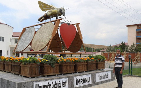 Galerinin tamamı için tıklayınızArı heykeli, Belediye Başkanı Açıl'ın isteği üzerine D-200 karayolu üzerindeki ilçenin girişinde bulunan otogara yerleştirildi. Demirer'in dükkanında yine hurda demir parçaları kullanarak yaptığı balık sehpa ayakları ve leylek heykelleri de dikkat çekiyor.