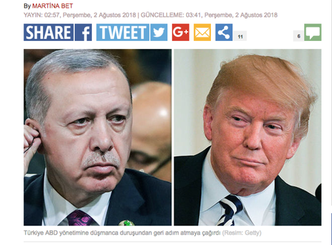 Galerinin tamamı için tıklayınızGazete, “Üçüncü Dünya Savaşı: Türkiye ABD’yi tehdit ediyor ve Trump’ın yaptırımlarını ‘Düşmanca’ olarak tanımlıyor” başlığını attı. Gazete daha önce de Kuzey Kore ile ABD arasındaki gerilimde benzer bir başlık atmış fakat iki ülke bu olaydan kısa bir süre sonra ilişkilerini normalleştirmişti.