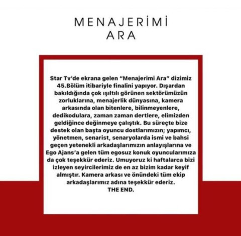 “Star Tv’de ekrana gelen “Menajerimi Ara” dizimiz 45.Bölüm itibariyle finalini yapıyor. Dışardan bakıldığında çok ışıltılı görünen sektörümüzün zorluklarına, menajerlik dünyasına, kamera arkasında olan bitenlere, bilinmeyenlere, dedikodulara, zaman zaman dertlere, elimizden geldiğince değinmeye çalıştık. Bu süreçte bize destek olan başta oyuncu dostlarımızın; yapımcı, yönetmen, senarist, senaryolarda ismi ve bahsi geçen yetenekli arkadaşlarımızın anlayışlarına ve Ego Ajans’a gelen tüm egosuz konuk oyuncularımıza da çok teşekkür ederiz. Umuyoruz ki haftalarca bizi izleyen seyircilerimiz de en az bizim kadar keyif almıştır. Kamera arkası ve önündeki tüm ekip arkadaşlarımız adına teşekkür ederiz. THE END.”