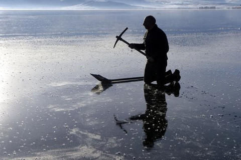 Galerinin tamamı için tıklayınızGöl kıyısında balık lokantası işleten Atalay Uzunkaya, Çıldır Gölü'nün buz tuttuğunu belirterek, "Bir hafta içinde atlı kızaklar göl üzerine çıkabilir. Şu an ben rahatlıkla göl üzerinde dolaşabiliyorum. Bu manzara mükemmel. Herkesin burayı görüp yaşaması lazım." dedi.
