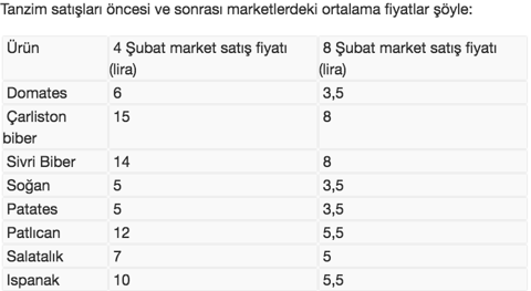 Tanzim satışlar başladı başlayalı başta sosyal meyda olmak üzere marketlerde de fiyatların aşağıya çekildi bilgisi yer aldı. Haftalık bilançosunu açıklayan İstanbul Büyükşehir Belediyesi rakamlarına göre 1 hafta içinde 2 bin 510 ton sebze satışı gerçekleşti. İstanbullular en çok domates satın aldı. Bir hafta içinde bin 200 ton domates, 673 ton patates, 354 ton soğan, 106 ton ıspanak, 79 ton çarliston biber, 38 ton salatalık, 32 ton sivri biber ve 28 ton patlıcan vatandaşa satıldı.Tanzim noktalarında sebze satışlarının başlamasıyla sebze hallerinde ve marketlerde de fiyatlar neredeyse yarı yarıya düştü. İstanbul Büyükşehir Belediyesinin kurduğu tanzim satış noktalarında ise domates 3, patates 2, soğan 2, patlıcan 4,5, salatalık 4,5, ıspanak 4,5, çarliston biber 6 ve sivri biber 6 liradan satılıyor.
