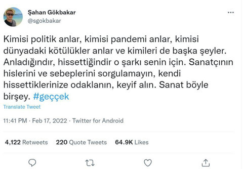 Galerinin tamamı için tıklayınızŞahan Gökbakar'dan Tarkan savunması: Sosyal medya hesabını aktif şekilde kullanan ünlü isimlerin başında gelen ve gündeme dair yaptığı paylaşımlarla sık sık adından söz ettiren Şahan Gökbakar, Tarkan'ın yeni şarkısıyla ilgili de bir yorum yaptı. Twitter hesabından paylaşım yapan Gökbakar, "Kimisi politik anlar, kimisi pandemi anlar, kimisi dünyadaki kötülükler anlar ve kimileri de başka şeyler. Anladığındır, hissettiğindir o şarkı senin için. Sanatçının hislerini ve sebeplerini sorgulamayın, kendi hissettiklerinize odaklanın, keyif alın. Sanat böyle bir şey" dedi.