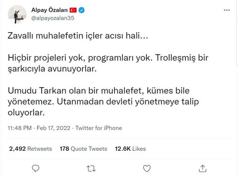 “Zavallı muhalefetin içler acısı hali... Hiçbir projeleri yok, programları yok. Trolleşmiş bir şarkıcıyla avunuyorlar. Umudu Tarkan olan bir muhalefet, kümes bile yönetemez. Utanmadan devleti yönetmeye talip oluyorlar.”