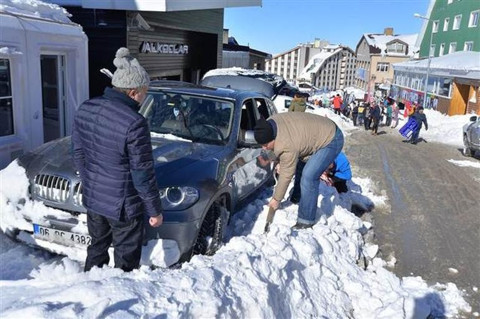 Günler sonra güneşin yüzünü göstermesiyle pistlere akın eden tatilciler, kayak yaptıktan sonra dönüş için hazırlanmaya başladı.