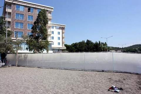 İZMİR'in Aliağa İlçesi'nde tatilcilerin denize girmek için kullandığı plaj, 'Miss Exclusive Of The World Uluslararası Güzellik Yarışması'na katılan güzeller için paravanla çevrildi.