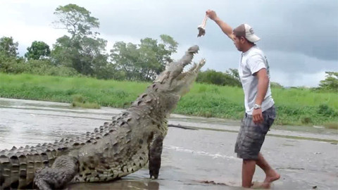 Elindeki tavuk ve et parçalarını yere vurarak timsahı üzerine çeken tur rehberi, tam yem verecekken kandırdığı hayvanı kızdırmaya başlıyor.