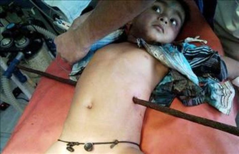 3 yaşındaki bu Hintli çocuk, dini kutlamalar esnasında çatıdan düşmüş ve vücuduna demir çubuk saplanmış