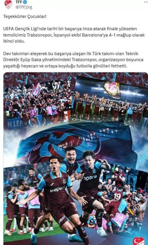 UEFA Gençlik Ligi final maçında Trabzonspor U19, İspanyol ekibi Barcelona'ya 4-1 mağlup oldu ve turnuvayı ikinci tamamladı.Trabzonspor, UEFA Gençlik Ligi'nde final oynayan ilk Türk takımı oldu. Gençlerin bu tarihi başarısı, sosyal medyada da gündem olurken, birçok tebrik paylaşımı yapıldı.İşte o paylaşımlar TFFDr. Osman Aşkın BakTrabzonsporUğurcan ÇakırBurak YılmazFatih TerimFenerbahçe Futbol AkademiKulüpler BirliğiUğur Okulları İstanbulspor A. Ş.Antalyaspor