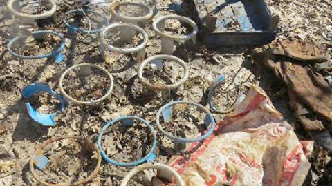 "4 Kalaşnikof piyade tüfeği, 1495 Kalaşnikof piyade tüfeği fişeği, 10 boş Kalaşnikof piyade tüfeği şarjörü,1 mayın, 550 kilo amonyum nitrat, 500 gram C4 patlayıcı, 1 roket atar, 3 anti tank roket atar mühimmatı, 2 anti personel roket atar mühimmatı, 7 roket atar sevk fişeği, 1 el bombası, 1 gece görüş dürbünü, 4 el dürbünü, saate bağlanmış 3 el telsizi, 51 adet büyük pil, 750 metre elektrik kablosu, 1 güneş paneli, 2 küçük tüp, 15 adet kesilmiş tüp başı, 1 araç aküsü, 16 terörist kıyafeti, 11 şemsiye, 153 kilo yiyecek malzemesi ile çok sayıda yaşam malzemesi."