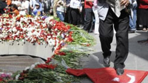Anıta kırmızı ve beyaz karanfiller bırakan kalabalık, sözde