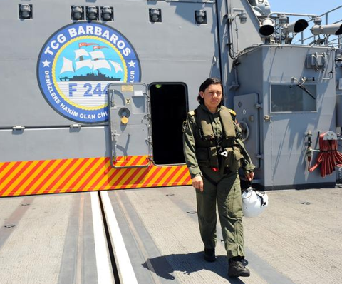 Deniz Kuvvetleri Komutanlığı'nın planlı tatbikatlarından DENİZKURDU-13 Fiili Deniz Tatbikatı'na katılan Barbaros Fırkateyni'nin kadın subayları, zorlu işleri başarıyla gerçekleştiriyor. Tatbikat kapsamında Aksaz Limanı açıklarındaki faaliyetlerini sürdüren savaş gemisi Barbaros Fırkateyni'nin 200 personeli arasında görev yapan üç kadın subay, zorlu görevler karşısındaki başarılı çalışmalarıyla dikkati çekiyor. Deniz Kuvvetleri Komutanlığı'nın tek kadın pilotu Binbaşı Zerrin Tosun, gemiye konuşlandırdığı helikopterini her türlü görev için hazır bekletiyor.