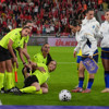 UEFA Uluslar B Ligi play-out rövanş müsabakasında Türkiye ile Kosova İzmir Gürsel Aksel Stadında karşılaşmasında ulusal marşlar okunurken maçın orta hakemi Michalina Diakow fenalaşarak yerde kaldı.