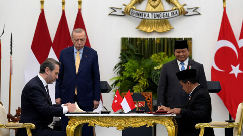 Abone olCumhurbaşkanı Recep Tayyip Erdoğan ile Endonezya Cumhurbaşkanı Prabowo Subianto, 10 milyar ABD doları hacmindeki ikili ticaret hedefine ulaşma kararlarını teyit ederek, bu hedefe, ilk aşamada 2026'ya kadar iki ülke arasında sınırlı tercihli ticaret anlaşması, sonraki aşamada ise Türkiye-Endonezya Kapsamlı Ekonomik Ortaklık Anlaşmasına (CEPA) yönelik tercihli ticaret planı geliştirilerek ulaşılabileceğini belirtti.