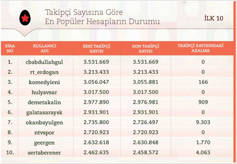 Galerinin tamamı için tıklayınızTwitterda en çok takip edilenler zirvesinde sosyal medyaya yönelik eleştirilerle gündeme gelen Başbakan Erdoğan ikinci sırada bulunuyor.