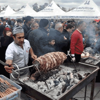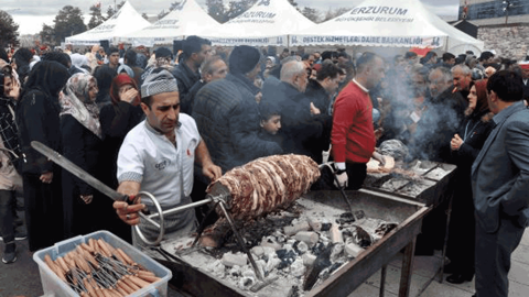 43'üncü Turizm haftası Kapsamında, Havuzbaşı Kent Meydanı'nda 'Cağ Kebap Müzik Folklor Şöleni' düzenlendi. Şölende, öğrenciler 7 farklı bölgeden folklor gösterisi yaptı. 7 ayrı işletme tarafından meydana, cağ kebap ocakları kuruldu.Uzun kuyruklar oluştu Ocakların yakılmasının ardından bir gün öncesinden hazırlanan etler pişirilmeye bırakıldı. 500 kilo etten yapılan cağ kebabından almak isteyenler uzun kuyruklar oluşturdu.Ücretsiz ikram Pişirilen etler, lavaş ekmekler arasına konularak ücretsiz olarak vatandaşlara ikram edildi.1,5 saatte tükendi Dağıtılan 500 kilo cag kebabı, 1,5 saatte tükendi. Cağ kebabının ücretsiz dağıtılmasından çok memnun olduklarını belirten vatandaşlar, etkinliklerin her yıl yapılmasını istedi. Turizm Haftası etkinlikleri Turizm Haftası'nın son gününün şölen havasında geçmesini istediklerini söyleyen Kültür ve Turizm İl Müdürü Cemal Almaz, "Turizm Haftası etkinliklerinin son gününü şölenle bitiriyoruz.Folklor, spor şöleni ve cağ kebabı ikramımız var. 7 bölgenin folklor ekibi oynattık. Kitap ödüllü spor karşılaşmaları yaptık. Erzurum'u en meşhur cağ kebap ustaları biz de ikramda bulunalım istediler. Turizmin farkındalığı ortaya çıksın, yeni mesajlar verelim istedik.''İlk kez ben yaptım'' İşletmecilerinden Kemal Koç ise koyun ve kuzu etinden yapılan cağ kebapta yalnızca soğan, karabiber ve tuz kullanıldığını söyledi. Cağ kebabının geçmişinin Osmanlı dönemine kadar gittiğini aktaran Koç, "Dedelerimizden kalma bir kebap. O dönem cağ kebap ismi yoktu. Evlerde, yollarda, ilçelerde, beldelerde yapılan bir kebaptı. İlk kez 1985 yılında Erzurum'da ben yapmaya başladım. 3 yılda Türkiye'ye, dünyaya yayıldı. Çin'e bile usta gitti. Şimdi bir sektör haline geldi" diye konuştu.