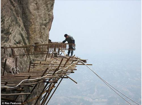 Galerinin tamamı için tıklayınızÇinli işçiler uçuruma turistik amaçla kullanılmak üzere ahşap yol döşüyorlar.