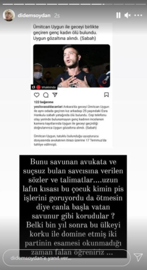 Kamuoyunda 'Aleyna Çakır' olarak bilinen Sema Esen'in (21) geçen yıl 3 Haziran'da Keçiören'deki evinde ölü bulunmasıyla ilgili hakkındaki soruşturma süren Ümitcan Uygun, bu kez de Esra Hankulu'nun 3 Ağustos'ta Mamak ilçesi Akdere Mahallesi'ndeki evinde ölü bulunmasıyla ilgili gözaltına alınmıştı.Emniyette yapılan işlemlerin ardından Ümitcan Uygun tutuklanmıştı. Yaşananlar sonrası birçok ünlü isim Uygun'a savaş açmıştı.Uygun'a, Twitter, Instagram ve Facebook gibi sosyal medya mecralarından hakaret edildiği gerekçesiyle avukatı suç duyurusunda bulundu. Bugüne kadar bini aşkın kişi hakkında Uygun'a hakaret ettiği iddiasıyla suç duyurusunda bulunulduğu öğrenilirken bu isimler arasında ünlüler de yer alıyor.Uygun'a hakaret ettiği iddiasıyla suç duyurusunda bulunulan ünlüler arasında Deniz Akkaya, Fatih Ürek, Kemal Doğulu, Didem Şarman, Ayşe Arman, Hadise ve Turgay Demirel de bulunuyor.Deniz Akkaya'ya resmi instagram hesabından "Ümitcan Uygun adına açılan hesaptan gazetecilere tehdit" haberini paylaşarak altına yaptığı "Ümitcan Uygun adına açılan hesaptan gazetecilere tehdit" haberinin altına sert yorum yapmıştı.Akkaya'nın "Lan ağzımı bozacağım. Ulan şerefsizin şerefsiz kandaşı. Hala hala tehdit. Kimi tehdit ediyorlar bunlar. Şunun abisi meydan dayağı istiyor belli oldu. Cezası ne ise ödeyelim ama bunun aklı başına gelsin" yorumu üzerine suç duyurusunda bulunulduğu öğrenildi.Şarkıcı Hadise'nin ise Hankulu'nun ölü bulunmasının ardından attığı "Daha önce başka bir kadını öldüren bir cani serbest bırakıldı. Bugün yanında bulunan başka bir kadın daha ölü bulundu. Yazık" tweeti hakaret sayıldı ve Uygun'un avukatı suç duyurusunda bulundu.Hakaret suçlarına karşı davalar açan Uygun'un avukatı Alev Acar, yaptığı açıklamada "Müvekkilin haklarını korumak adına birçok kişiye hakaret ettikleri gerekçesi ile suç duyurusunda bulunduk. Ne yazık ki bu isimler arasında; ünlüler, sosyal medya fenomenleri, milletvekilleri, gazeteciler de yer almakta." dedi.Uygun'un avukatı "Takipçisi yüksek sosyal medya kullanıcıları, ünlüler ve milletvekilleri tarafından yapılan paylaşımlar ile müvekkil hakkında yürütülen soruşturmalara ilişkin olarak sosyal medya üzerinden bir baskı oluşturulmaya çalışılmakta ve müvekkilin anayasal hakları ihlal edilmektedir. " diye konuştu.Açıklamanın devamında Uygun'un avukatı "Yargılamanın yapılacağı yer mahkemelerdir. Sosyal medya platformları üzerinden herhangi bir soruşturmayı yönlendirecek şekilde paylaşım yapılarak, soruşturmalara dahil olunması hukuki güvenirliğin azalmasına, insanların adalete olan inancının zedelenmesine neden olmaktadır" dedi.İşte Ümitcan Uygun'la ilgili sert tepki gösteren ünlüler ve paylaşımları...