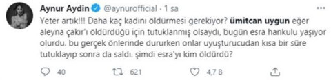 Kamuoyunda 'Aleyna Çakır' olarak bilinen Sema Esen'in (21) geçen yıl 3 Haziran'da Keçiören'deki evinde ölü bulunmasıyla ilgili hakkındaki soruşturma süren Ümitcan Uygun, bu kez de Esra Hankulu'nun 3 Ağustos'ta Mamak ilçesi Akdere Mahallesi'ndeki evinde ölü bulunmasıyla ilgili gözaltına alınmıştı.Emniyette yapılan işlemlerin ardından Ümitcan Uygun tutuklanmıştı. Yaşananlar sonrası birçok ünlü isim Uygun'a savaş açmıştı.Uygun'a, Twitter, Instagram ve Facebook gibi sosyal medya mecralarından hakaret edildiği gerekçesiyle avukatı suç duyurusunda bulundu. Bugüne kadar bini aşkın kişi hakkında Uygun'a hakaret ettiği iddiasıyla suç duyurusunda bulunulduğu öğrenilirken bu isimler arasında ünlüler de yer alıyor.Uygun'a hakaret ettiği iddiasıyla suç duyurusunda bulunulan ünlüler arasında Deniz Akkaya, Fatih Ürek, Kemal Doğulu, Didem Şarman, Ayşe Arman, Hadise ve Turgay Demirel de bulunuyor.Deniz Akkaya'ya resmi instagram hesabından "Ümitcan Uygun adına açılan hesaptan gazetecilere tehdit" haberini paylaşarak altına yaptığı "Ümitcan Uygun adına açılan hesaptan gazetecilere tehdit" haberinin altına sert yorum yapmıştı.Akkaya'nın "Lan ağzımı bozacağım. Ulan şerefsizin şerefsiz kandaşı. Hala hala tehdit. Kimi tehdit ediyorlar bunlar. Şunun abisi meydan dayağı istiyor belli oldu. Cezası ne ise ödeyelim ama bunun aklı başına gelsin" yorumu üzerine suç duyurusunda bulunulduğu öğrenildi.Şarkıcı Hadise'nin ise Hankulu'nun ölü bulunmasının ardından attığı "Daha önce başka bir kadını öldüren bir cani serbest bırakıldı. Bugün yanında bulunan başka bir kadın daha ölü bulundu. Yazık" tweeti hakaret sayıldı ve Uygun'un avukatı suç duyurusunda bulundu.Hakaret suçlarına karşı davalar açan Uygun'un avukatı Alev Acar, yaptığı açıklamada "Müvekkilin haklarını korumak adına birçok kişiye hakaret ettikleri gerekçesi ile suç duyurusunda bulunduk. Ne yazık ki bu isimler arasında; ünlüler, sosyal medya fenomenleri, milletvekilleri, gazeteciler de yer almakta." dedi.Uygun'un avukatı "Takipçisi yüksek sosyal medya kullanıcıları, ünlüler ve milletvekilleri tarafından yapılan paylaşımlar ile müvekkil hakkında yürütülen soruşturmalara ilişkin olarak sosyal medya üzerinden bir baskı oluşturulmaya çalışılmakta ve müvekkilin anayasal hakları ihlal edilmektedir. " diye konuştu.Açıklamanın devamında Uygun'un avukatı "Yargılamanın yapılacağı yer mahkemelerdir. Sosyal medya platformları üzerinden herhangi bir soruşturmayı yönlendirecek şekilde paylaşım yapılarak, soruşturmalara dahil olunması hukuki güvenirliğin azalmasına, insanların adalete olan inancının zedelenmesine neden olmaktadır" dedi.İşte Ümitcan Uygun'la ilgili sert tepki gösteren ünlüler ve paylaşımları...